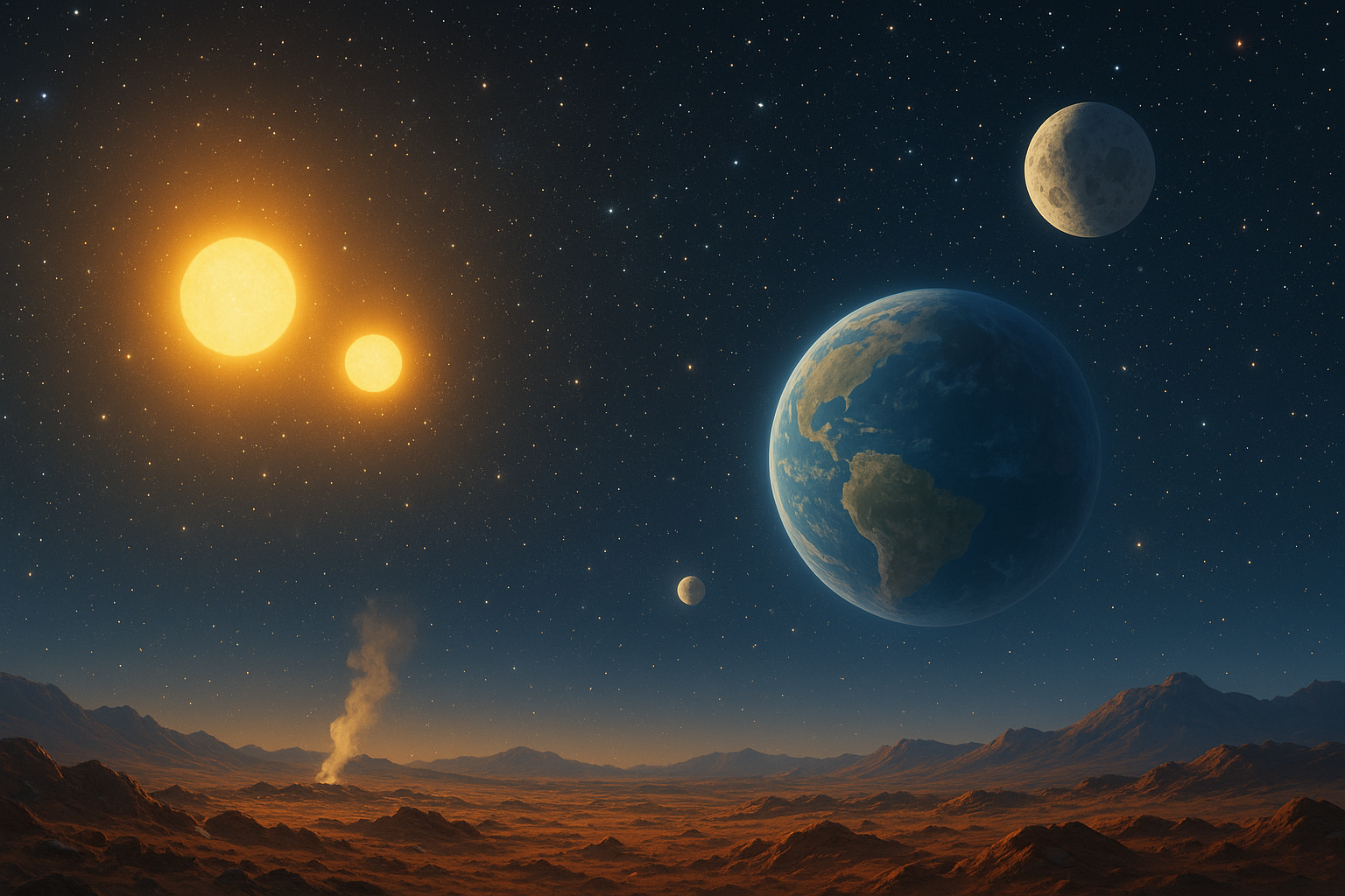 Н-цы видят спутники на фоне яркого звёздного неба, где свет тысяч звёзд почти как от полной Луны. Малый привлекает внимание быстрым бегом, а Большой — медленным движением и крупным диском. Спутники находятся в резонансе: Малый делает 5 оборотов, пока Большой делает один. Их гравитация помогает стабилизировать наклон оси планеты (23.5°), предотвращая резкие изменения климата. Ядро планеты, похожее на земное, и её вращение (24 часа за оборот) также поддерживают стабильность.