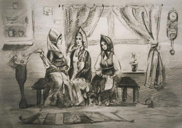 Первой в избу вошла Аглая. Была она смелее своих подруженек (да и замуж сильнее всех хотела). Зайдя, как и положено перекрестилась, вещи, принесенные с собой, в качестве оплаты предназначенные, на стол выложила, на лавку села, ждет. Хозяйка, напротив, устроилась и давай подарки перебирать: платок сразу на голову пристроила, бусы янтарные на шею повесила, в подаренное зеркало себя рассматривает. И молчком все. Не выдержала Аглая (а надо заметить: дева она была с характером, ― спуску никому не давала, ни братьям меньшим, ни маменьке годами преклонной) спросила, чуть наклоняясь: