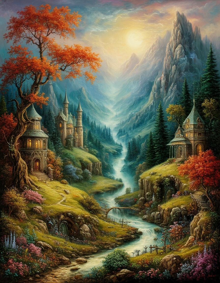 И только младший принц Аэций горько тосковал по ней. Своих автопортретов Маркиза не оставила, но у принца в его покоях висел ее пейзаж, который он любил рассматривать. Откуда-то издалека, из туманной дали, тёк ручей по оврагу, по обеим сторонам которого стояли славненькие миленькие домики, в которых жили гномики. Истоки ручья терялись в голубых горах, и юному принцу казалось, что где-то там, в туманном мареве, притаилась душа Маркизы…