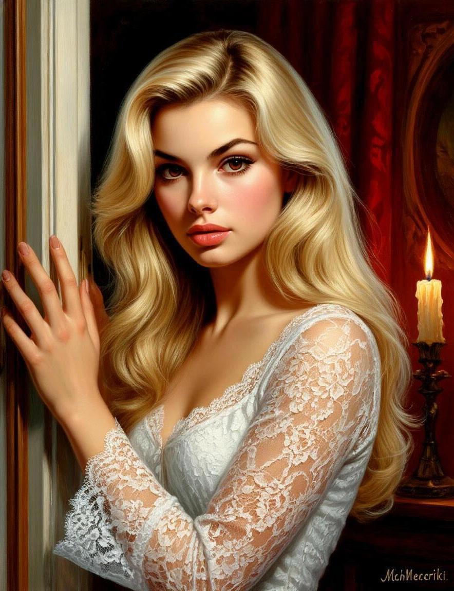 И вот однажды, когда он глянул на картину, то вдруг увидел там Маркизу. Она стояла близко, на переднем плане, и смотрела на него. Аэций застыл, чтобы не упустить видение, и долго глядел на нее… Потом все же протер глаза…, а когда открыл их, то Маркизы там уже не было… С тяжким вздохом принц опустился в кресло… и сердце его замерло: в дверном проеме стояла живая Маркиза и смотрела на него… Она была в белом кружевном пеньюаре с прозрачными гипюровыми рукавами, золотистые волосы разлились по плечам…