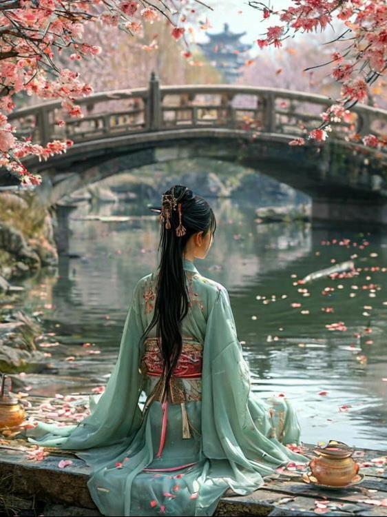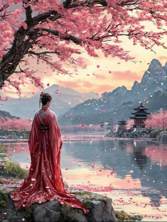 Как я хочу остаться с тобой! Пусть хотя бы мой образ в твоей глади задержится под этой цветущей вишней!