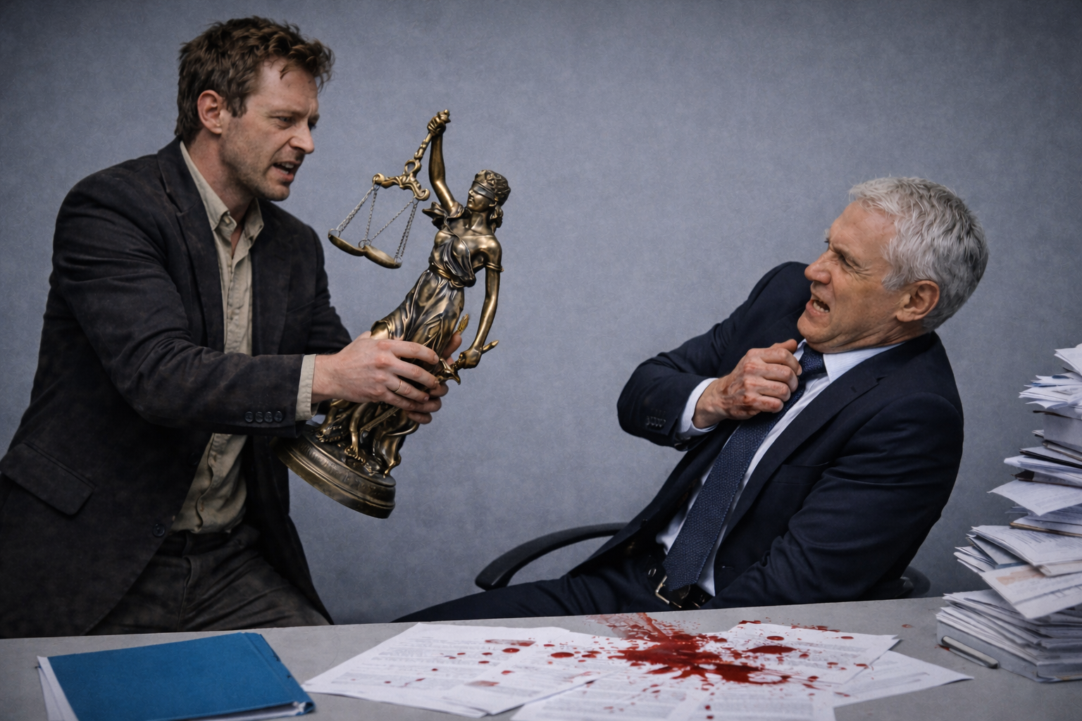 Майк почувствовал прикосновение иглоки вмонтированного в кресло медицинского блока и рванулся изо всех сил вперед. Фиксировавшие его руки браслеты на подлокотниках кресла не выдержали напора и лопнули. "А вот нечего было кресло в Китае заказывать!" - отстраненно подумал внезапно вырвавшийся на свободу клиент, бросаясь к столу и удивляясь несвоевременности данной мысли. Успел насладиться зрелищем ужаса, заполнившего расширенные зрачки Доктормана за мгновение до того, как тяжелая бронзовая статуэтка богини Фемиды, многие годы недвижно стоявшая на столе, врезалась в висок адвоката. Заливая официальные бумаги обильно сочащейся кровью, тот рухнул на стол.