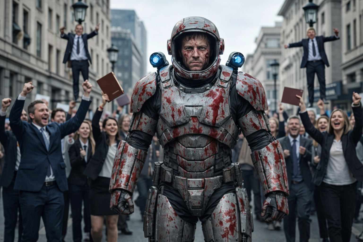 ...Когда придержанное таймером сообщение появилось в Сети, большей части членов Коллегии уже не было в живых. Удачненько это они назначили заседание на сегодня! Майк, в залепленном кровью и кусками мясистых юридических мозгов экзоскелете подошел к окну. На городской площади было оживленно. Освобожденный от юридической тирании народ стаскивал в центр площади найденые по всему городу сборники законов и постановления судов, заодно развешивая на ближайших столбах пытающихся скрыться юристов. Не уйдет никто!