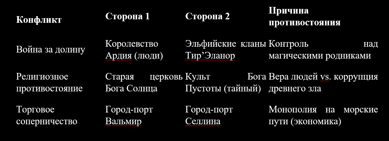 Такая таблица помогает визуализировать силы в мире. Вы видите, кто с кем враждует и почему. В дальнейшем, при разработке истории (Модуль 2) и общества, вы сможете расширять эти столбцы деталями. А пока этого достаточно, чтобы понять: в мире есть движущие конфликты, которые дадут пищу для сюжетов.