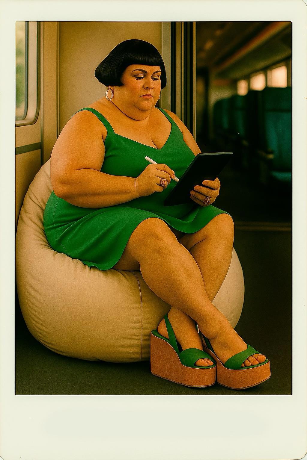 В сидячем вагоне № 6, куда вошёл растрёпанный и слегка закопчёный Поль, сидели двое из трёх пассажиров — мужчина у дальней двери и женщина средних лет. Женщине подошло бы имя Патрисия Стар — треугольное её головотело в провокационном зелёном сарафане венчала стрижка а-ля Мирей Матье, в треугольных руках планшет и стилус, на волосатых, закинутых одна на другую треугольных ногах — практичные двадцатисантиметровые пробковые платформы. Она сидела в проходе в белом кресле-мешке, вокруг неё, как электрон вокруг ядра, крутилась девочка лет семи, рожденная для себя.