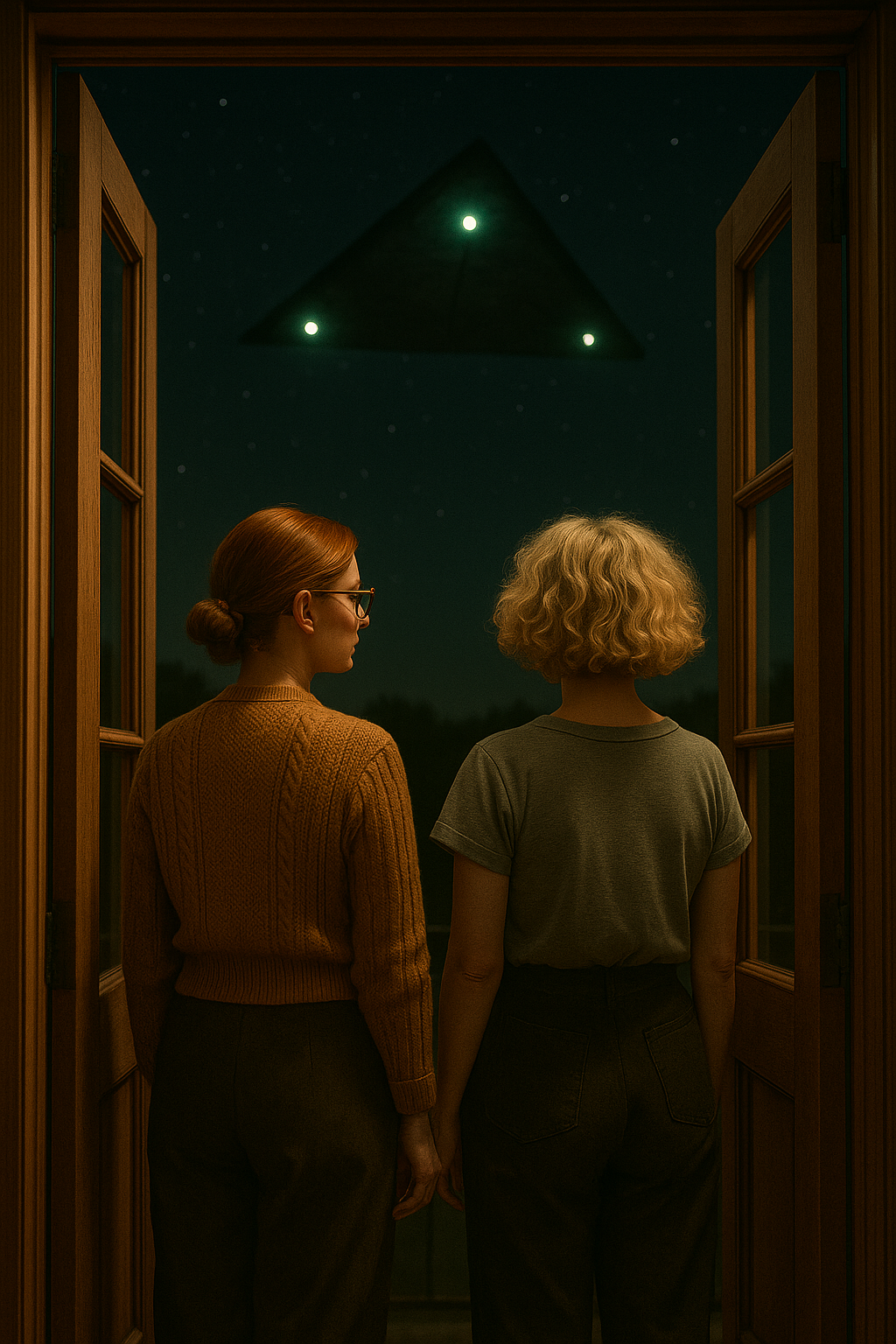 Прямо над ней в небе завис огромный треугольник. Темно-серый, с яркими светящимися огнями на каждом угле. Он выглядел пугающе. Большой… настолько большой, что Катя сразу поняла — это не самолёт. Не вертолёт и даже не чёртов дирижабль! Это что-то… иное.