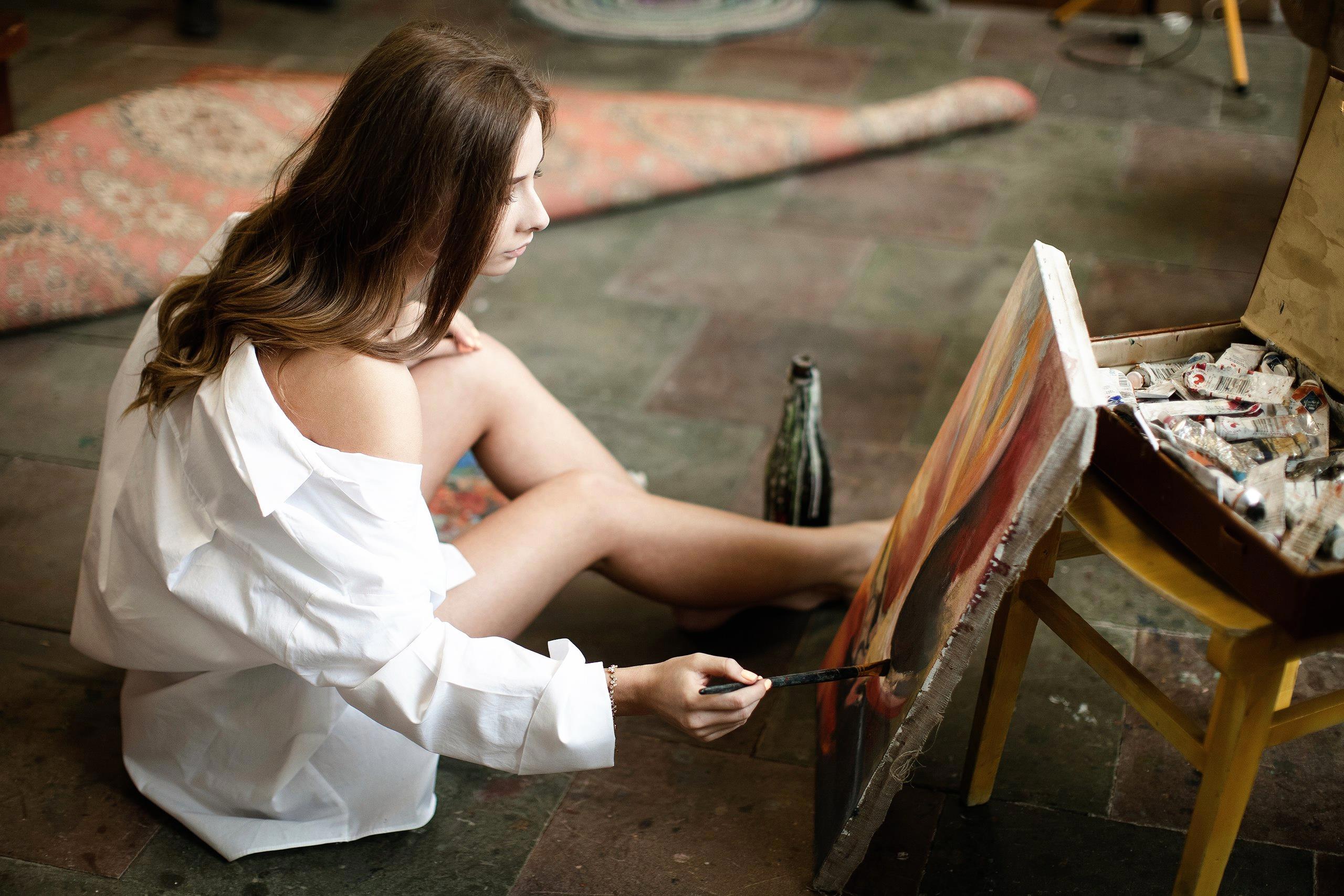 Сделав шаг назад от мольберта, Анна глядит на картину так и эдак.