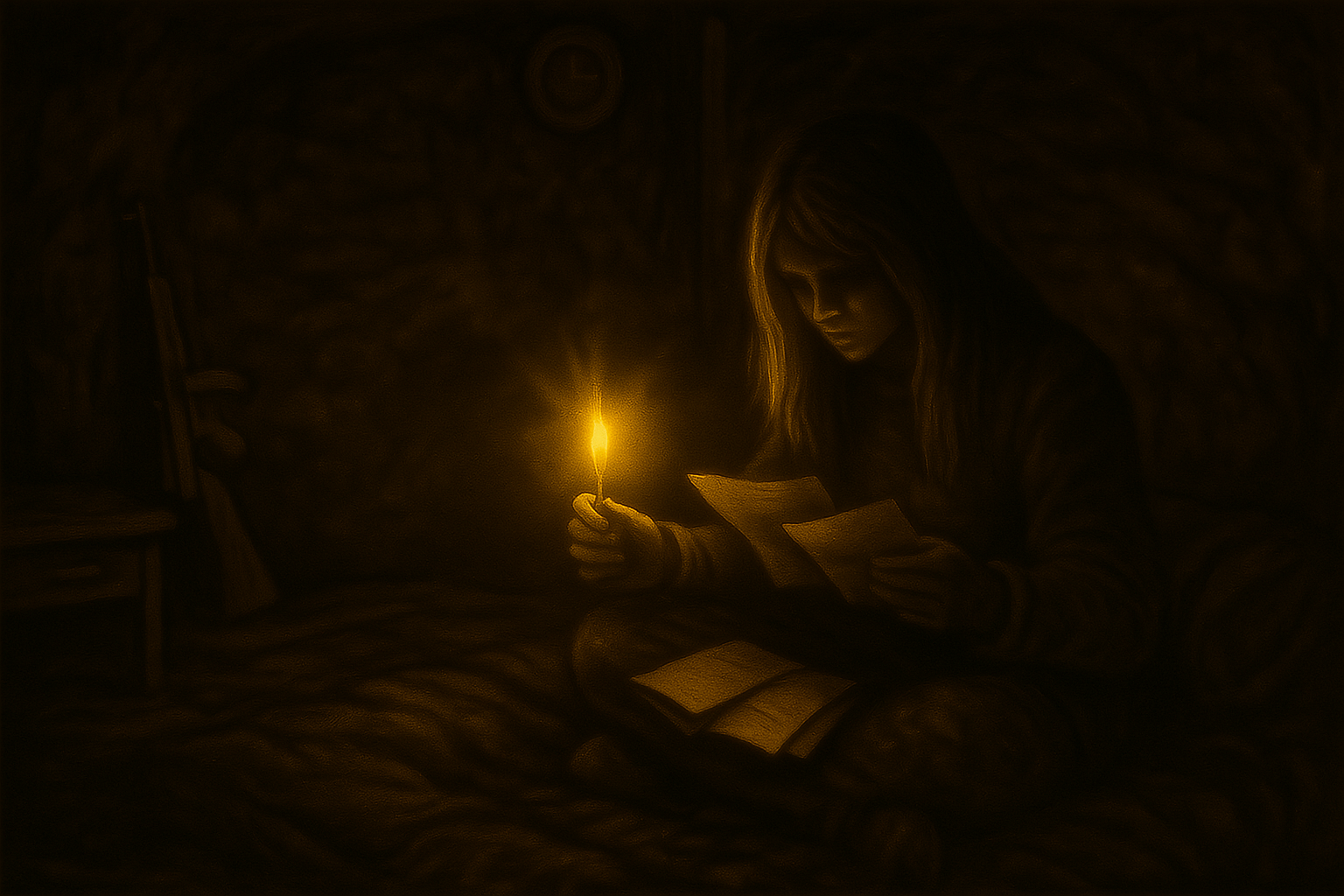 Так и закончился мой первый день в новом мире. Я села на свой спальник и наблюдая на пламя заметила несколько писем, что лежали на тумбочке. Взяв их, я вернулась на своё "уютное местечко". Письма, судя по всему других выживших. Я не придала значения тому, что какой-то человек собирал чужие письма и начала их читать. В одном из писем какой-то человек хвастался новому приобретению, он купил в коллекцию пистолет-пулемёт Томпсона и судя по написанному был просто счастлив. Другой же человек писал о старом ружье своего дедушки. "Похоже, это оружие времён Второй мировой войны... Не уверен, откуда он его взял и что он легален, ведь у моего деда было тёмное прошлое."