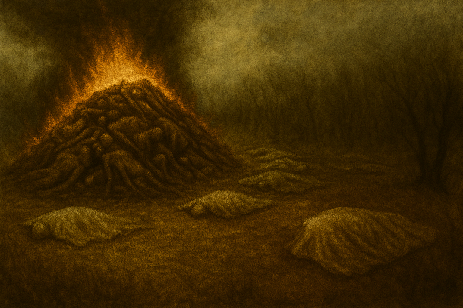 На моём пути было какое-то поселение, первое, что я увидела это большая футбольная площадка, а рядом с ней школу. На площадке я увидела молодого оленя и... заражённых. Трое мертвецов пытались загнать в угол бедное животное, чтобы растерзать. Я не дала им обидеть оленя. Когда момент синтиментальности покинул меня, в мой нос ударил сильный запах палёного мяса, подняв свою голову я опешила... Огромная куча трупов... Они до сих пор горели. Рядом с ними лежали и другие тела людей, но они были накрыты тканью и... признаков заражения я не заметила. Кто это мог сделать и для чего...?