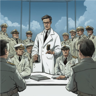 И вот, ученые раз за разом вываливали на военных горы цифр, цепочек нуклеотидов и малопонятных терминов, неведомым образом впихивая все это в небольшие, вроде бы, презентации и несколько папок с бумагами, а не привыкшие к таким ударам судьбы генералы уже начинали подумывать о строительстве из этих завалов фортификационных сооружений для защиты собственной психики. Во время очередного штормового вала научных данных председатель коллегии понял, что личный состав нужно срочно спасать.