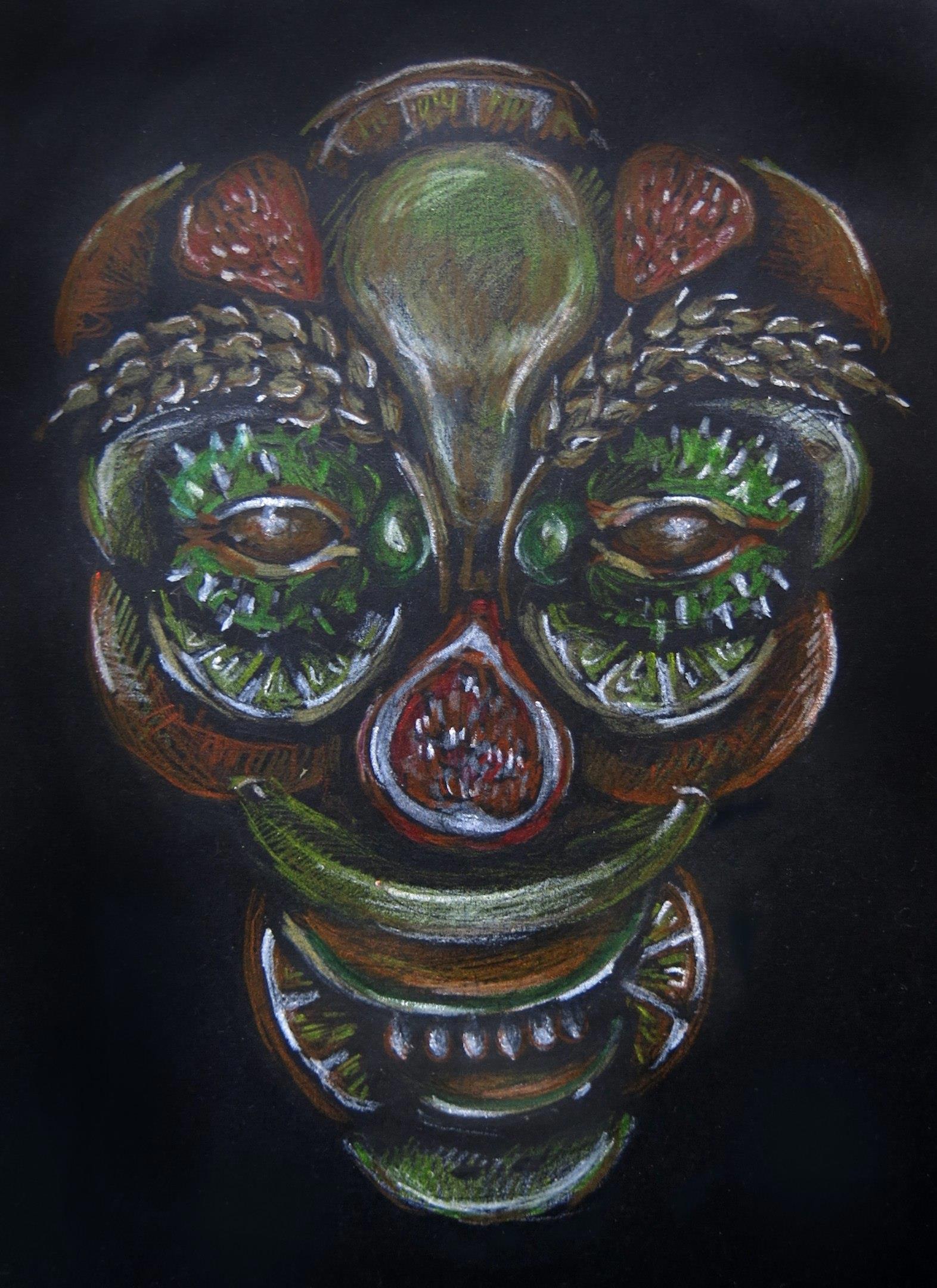 Изабелла прищурилась, и в воздухе проступили очертания черепа, украшенного сушёными дарами полей и садов. Над каштановыми глазами заколосились пшеничные брови, белёсый от кристалликов сахара инжир появился на месте носа, рыжие урючины стали румяными щеками, жёлтые цукаты из долек канталупы сложились в учтивую улыбку, а зубы были из пластинок миндаля, какими украшают пирожные.