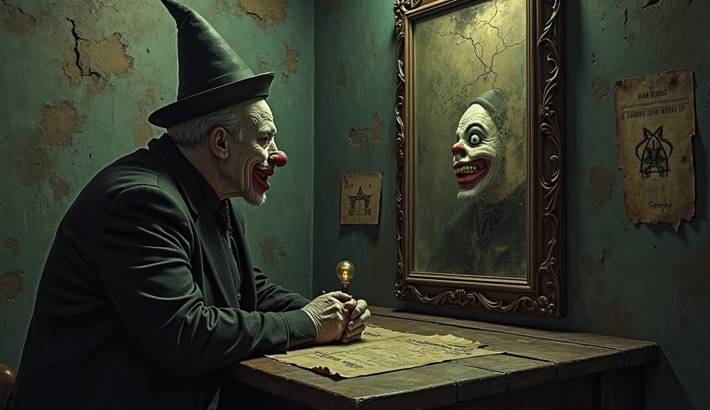 Сегодняшний вечер источал особенно густую эманацию тревоги. В своей гримёрной, тесной и низкой, как склеп под старой часовней, Август ощущал, как по спине ползёт ледяной червь иррационального страха. Зеркало, мутное, словно подёрнутое катарактой времени, испещрённое сетью трещин, похожих на руны забытого языка, отражало не столько его собственное лицо, сколько предвестие, застывшую гримасу грядущего смеха – улыбку, нарисованную поверх серой паутины усталости и подспудного, первобытного ужаса.