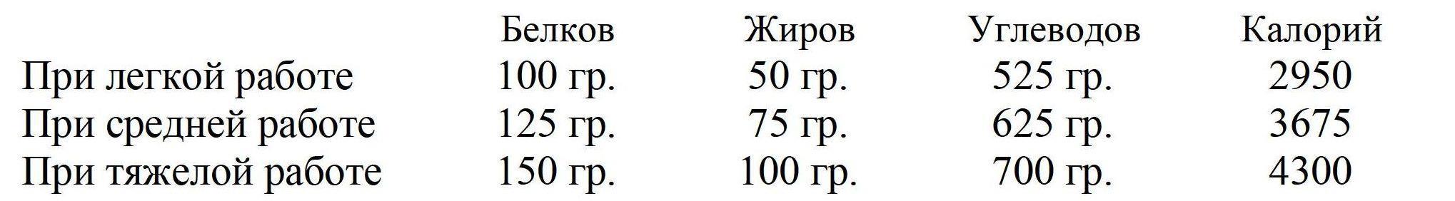 Калорийность рационов и нормы пищевых веществ. В таблице № 6 автор доклада о питании в армии США приводит теоретические данные о нормах пищевых веществ и калорийности суточного рациона взрослого человека /мужчины весом в 70 килограмм/, в зависимости от тяжести, производимой им работы. Согласно этих данных суточный рацион взрослого мужчины должен содержать: