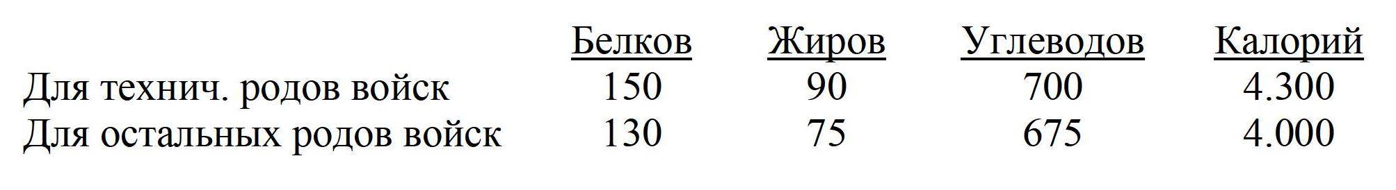 Если исходить из этих теоретических и практических данных, а также учесть, что за последние годы, в связи с оснащением армий сложной боевой техникой, значительно возросла напряженность боевой учебы не только специальных технических родов войск, но также и пехоты, то следует делать вывод, что суточный рацион военнослужащих должен ориентировочно содержать: