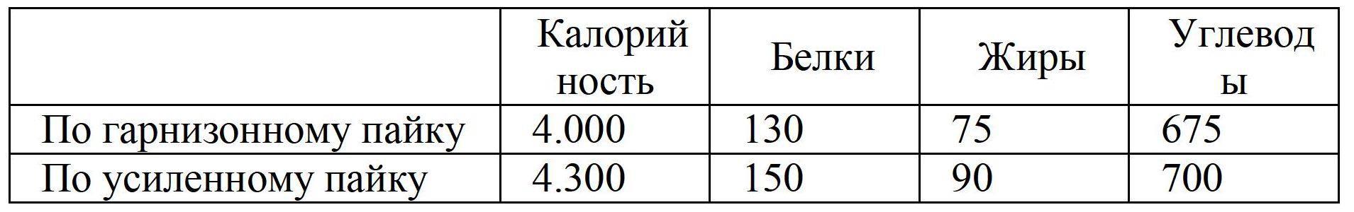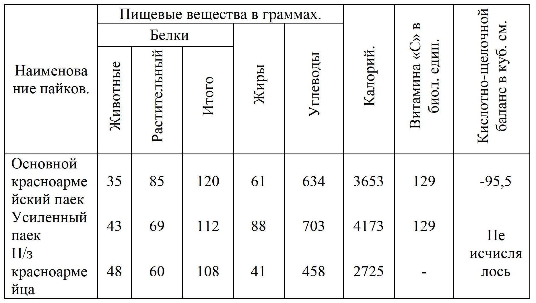 Пищевая ценность основных пайков РККА и неприкосновенного носимого запаса