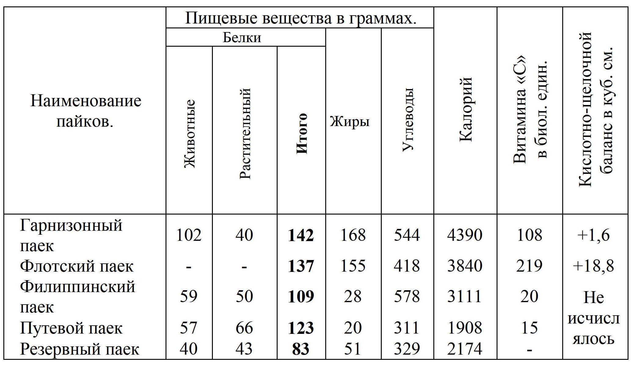Флотский паек для довольствия личного состава морского флота в мирное и военное время. Состав этого пайка в докладе не приведен. Имеются лишь данные о пищевой ценности его и указания о том, что он по своему составу близко подходит к гарнизонному пайку. Это утверждение автора доклада не совсем верно, так как разница в калорийности этих двух пайков составляет 550 калорий в пользу гарнизонного пайка. Поэтому флотский паек значительно ниже гарнизонного пайка по пищевой ценности.