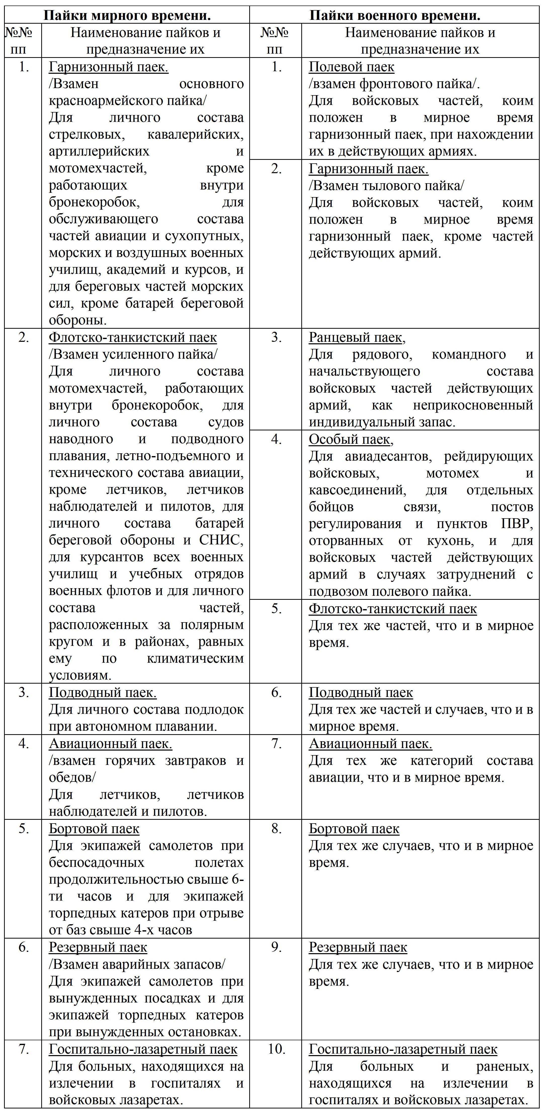 В настоящее время в РККА существует 16 основных и дополнительных пайков мирного времени и 3 нормы пищевых запасов. В военное время к ним добавляются два пайка - фронтовой и ранцевый запас и исключается один паек - горячие обеды для летчиков и пилотов. Значит, РККА имеет всего 21 паек.