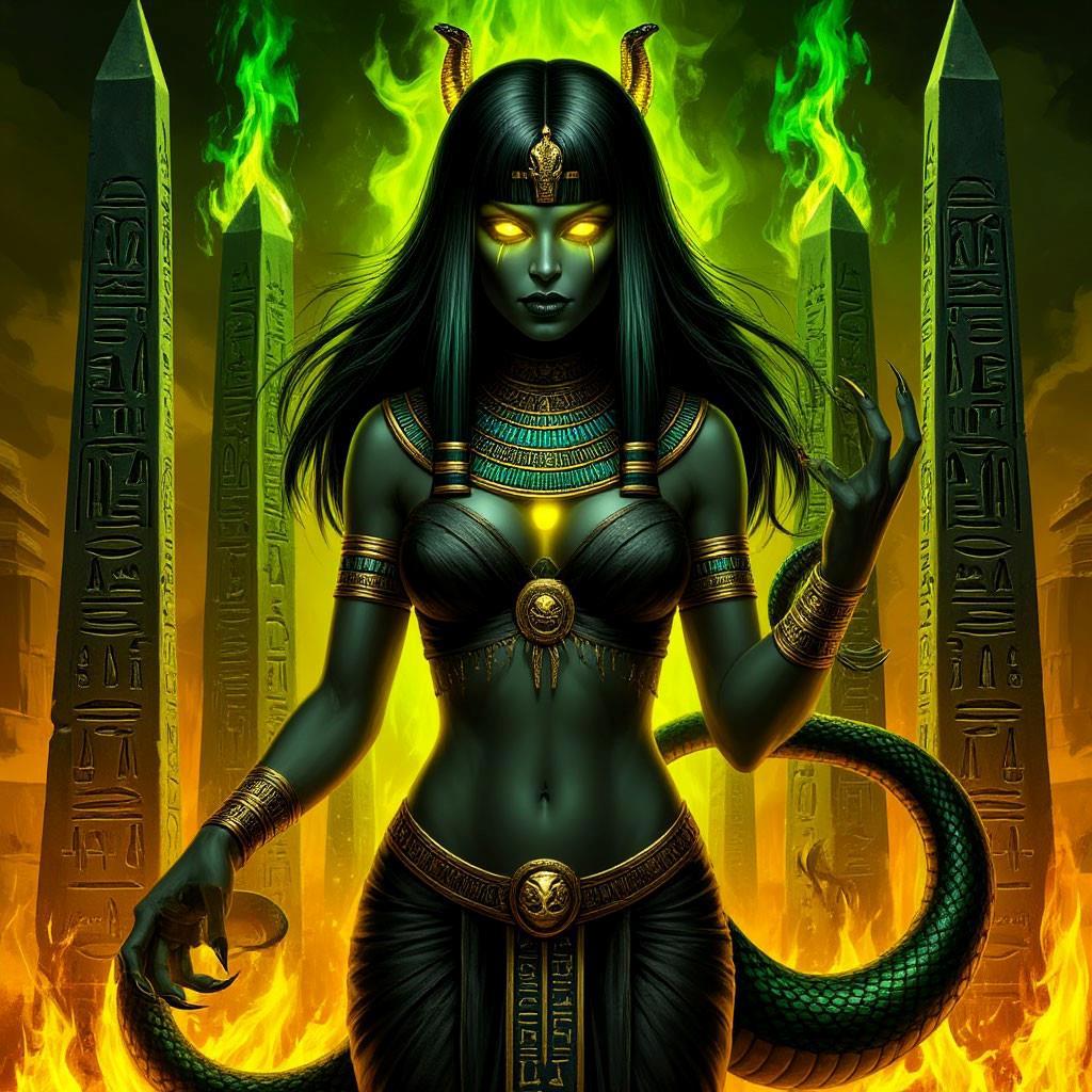 Прорицательницу охватило призрачно‑зелёное пламя. Она преобразилась: глаза наполнились золотым блеском, ноги превратились в извивающийся хвост змеи, а голос стал похож на шипение — сама богиня вселилась в тело своей слуги.
