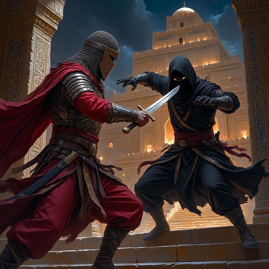 Если бы не предупреждение богини, они легко истребили бы стражу, но караульные в ту ночь были настороже и вовремя заметили врага. На ступенях храма и на улицах развернулась жестокая схватка между одетыми в красное стражами‑сакхалибами и тайными убийцами в чёрном. Они не уступали друг другу в мастерстве, но самоотверженность Акирама и отвага его воинов помогла одолеть незваных гостей.