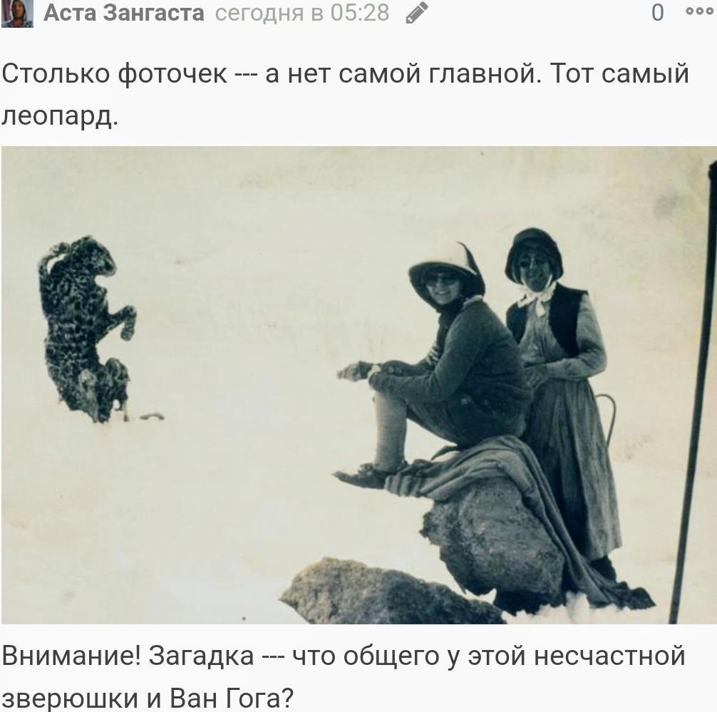 "...Почти у самой вершины западного пика лежит иссохшиймёрзлый труп леопарда. Что понадобилось леопарду на такойвысоте , никто объяснить не может."