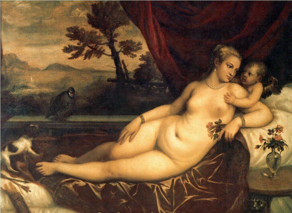 Естественно, не может же художник то и дело копировать самого себя! Но вот источник вдохновения и Тициана был все тот же. И даже собачка на первой из двух картин почти такая же, как на картине «Венера Урбинская».