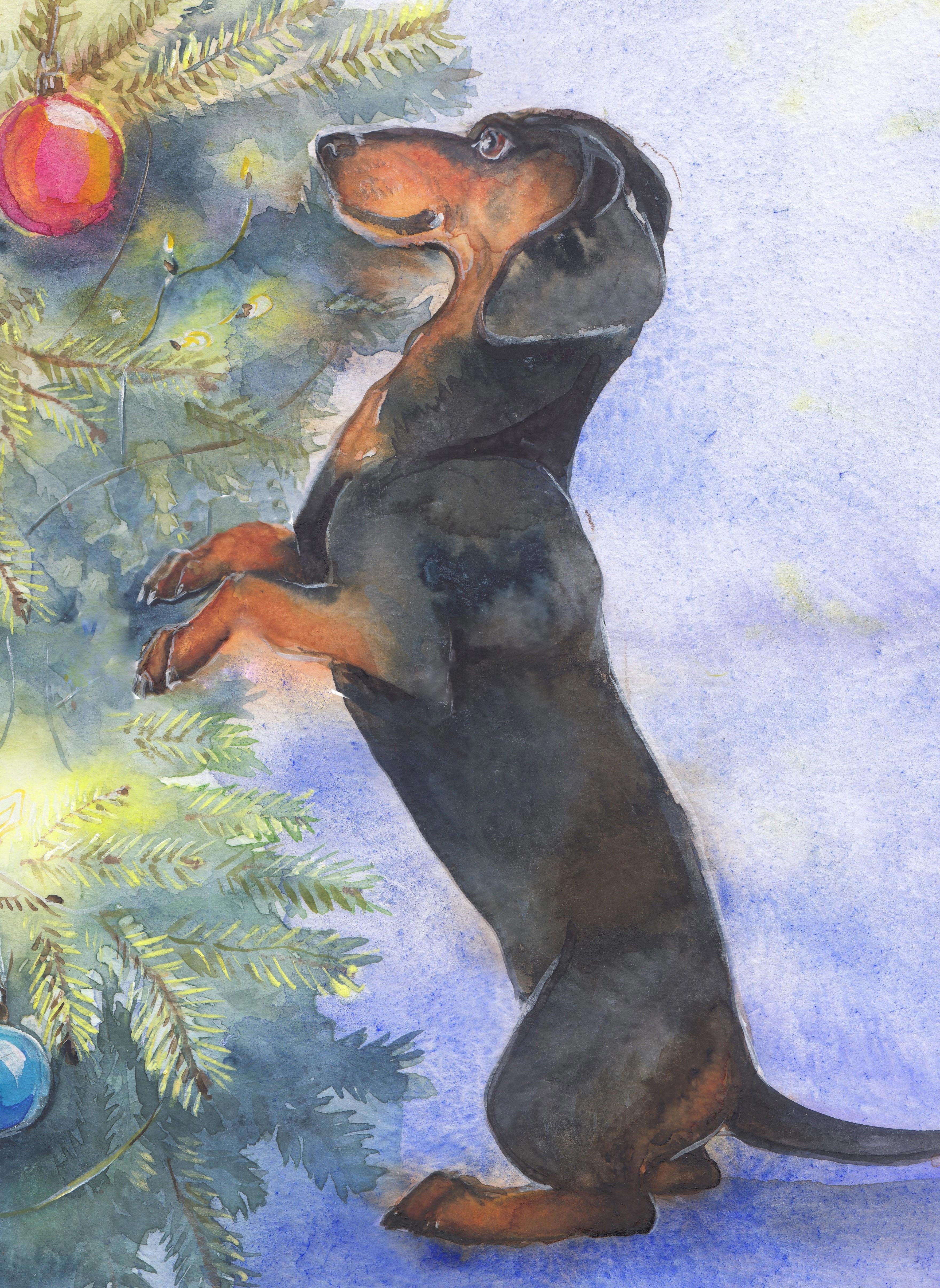И вот наступило 31 декабря. Ёлка, покачивая тяжёлыми, мохнатыми лапами, торжественно стоит посередине комнаты - в пышной мишуре, стеклянных гирляндах и блестящих «дождиках». Красота! Тюпочка подошла, осторожно понюхала – и тут же отпрыгнула назад: укололась о хвоинку (ёлка-то настоящая, живая!). Обиженно фыркнула и отвернулась: не надо, мол, нам такого счастья. Я ласково погладил таксу по спинке: