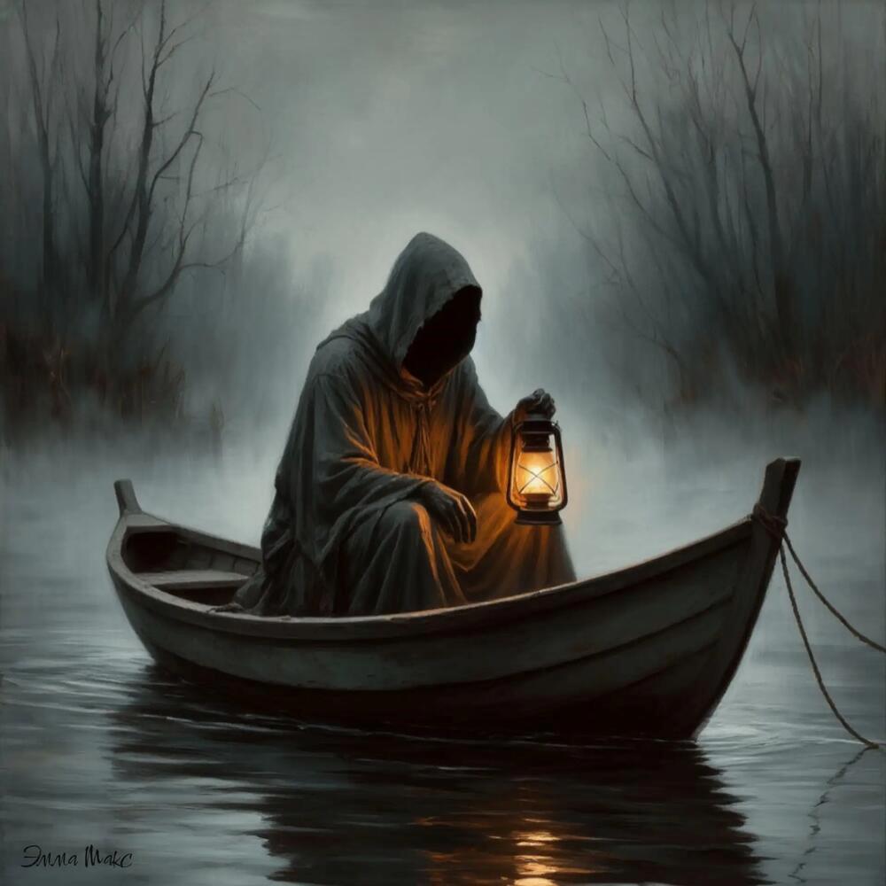 Женщина села на кровать. Комната была самой обычной. Светлые обои, в окошке тот же мрачный день, что был и внизу у девочки. Стол завален грязными кружками, возле шкафа на кресле грудой валялось грязной белье. Женщина сидела на кровати и пялилась в стену. Ксюша тоже посмотрела на нее и увидела большую картину. На ней была изображена темная фигура, сидящая в лодке, и держащая фонарь в руке.