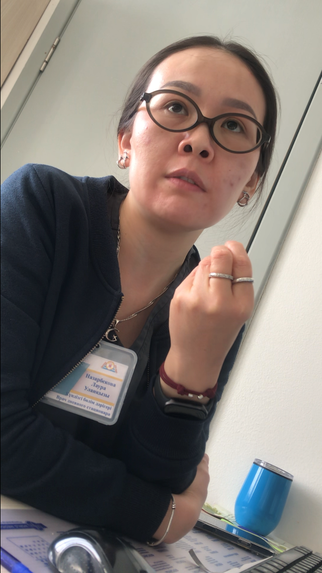 Перед вами — заведующая дневным стационаром, врач-терапевт Назарбекова Лаура Уланкызы. За её плечами — 8 лет профессионального стажа, а уже 2,5 месяца она уверенно руководит отделением дневного стационара, где под её контролем находятся три палаты и 25 коек-кушеток. Это большая нагрузка и огромная ответственность, но ещё больше — это высокая миссия: помогать людям восстанавливать здоровье и возвращаться к полноценной жизни.