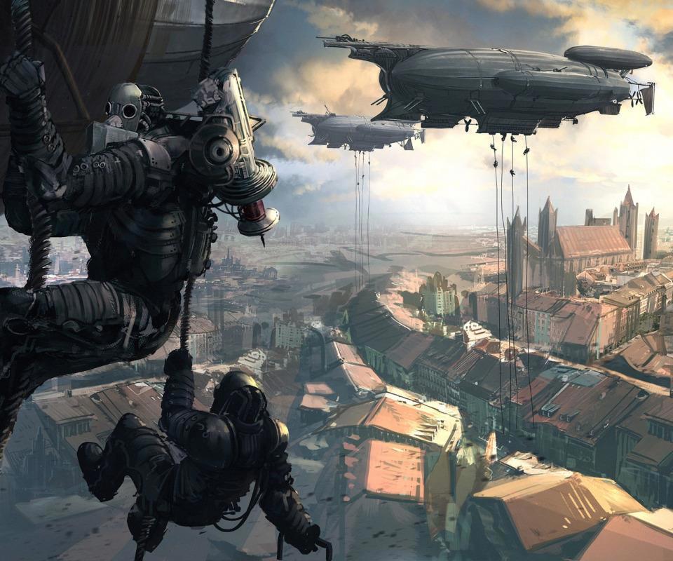 Пикируя вниз как заправский ястреб, голубая сойка заметила, что в небе над человеческим городом повисло ещё три огромных корабля (точно таких же как тот который она только что покинула). Из трюмов по канатам к земле скользили многочисленные закованные в боевые скафандры фигурки.