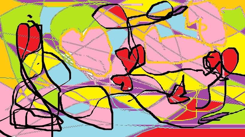 Три розовых сердца, не обведенные черной линией, создают фон композиции. Тона розовый, салатовый, голубой, желтый и фиолетовый создают легкую и смешанную палитру, на фоне которой алые сердца выступают яркими акцентами.