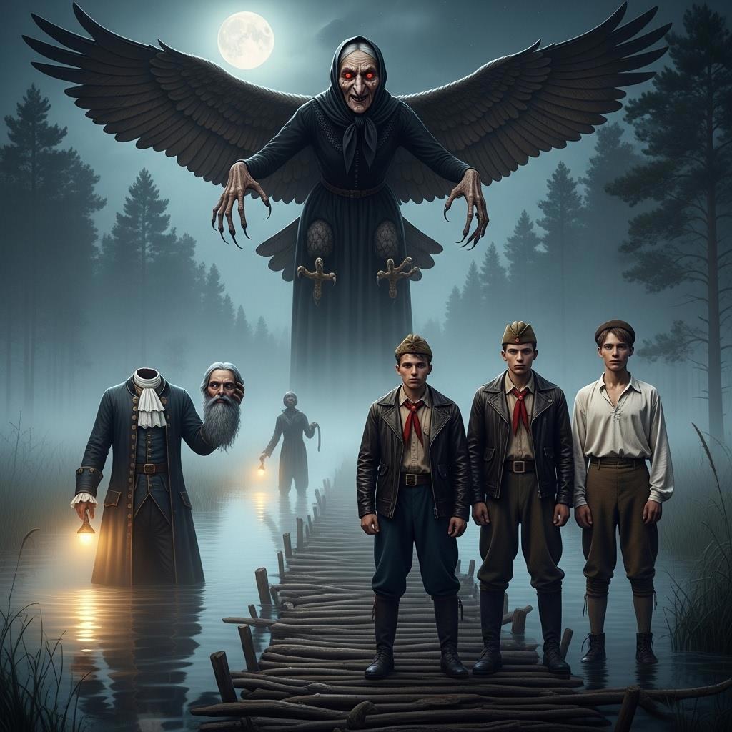 Мертвые Карагаевы качнулись вперед, вытянув когтистые руки, чтобы рвать и терзать. Миша, Генка и Жердяй сбились в кучу в жалком ужасе: весь их атеизм и коммунистические убеждения рушились перед могильными ужасами болота. Бронзовый орел кружился над их головами, смех старой карги раздавался как похоронный звон, когда она подняла иссохшую руку и указала костлявым пальцем на мальчиков. В тот же миг земля под их ногами начала хлюпать и бурлить. Генка закричал, когда трясина разверзлась и в мгновение ока поглотила его по пояс. Глаза Жердяя выпучились от ужаса, когда он наблюдал, как Генка тонет в вонючей жиже.