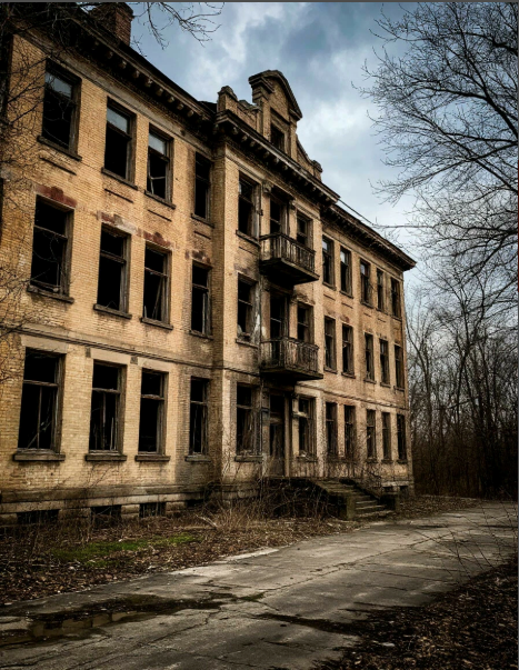 Тяжелые двери с оторванными петлями скрипят на ветру, прямо музыка стона забытых душ. Стены, когда-то выкрашенные в бледно-малахитовый — цвет ложного успокоения — теперь покрыты плесенью и черными подтёками, словно кровь, просочившаяся сквозь штукатурку.