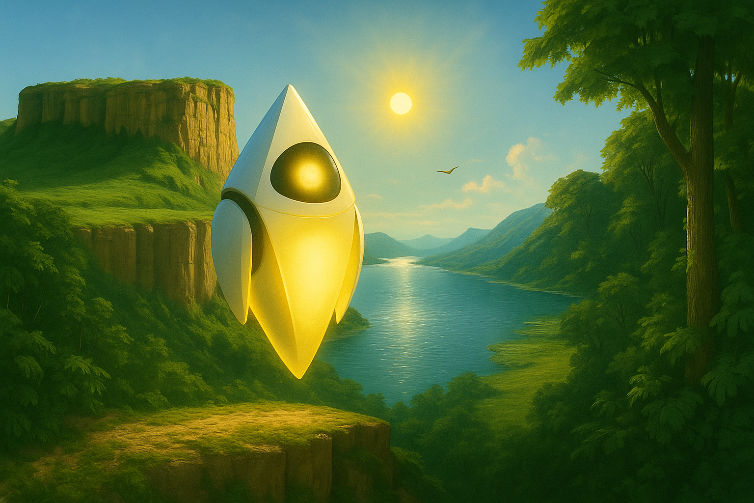 Вдалеке озеро, кристально чистое, любо дорого посмотреть, а как солнышко светит на него, слепит эка не видать. По бокам от него самые натуральные джунгли, за исключением считай одного голого холма, а так, зелено-зелено, такого в современных мегаполисах не увидеть, а над озером какая-то птица — далеко — не разобрать. Красота…