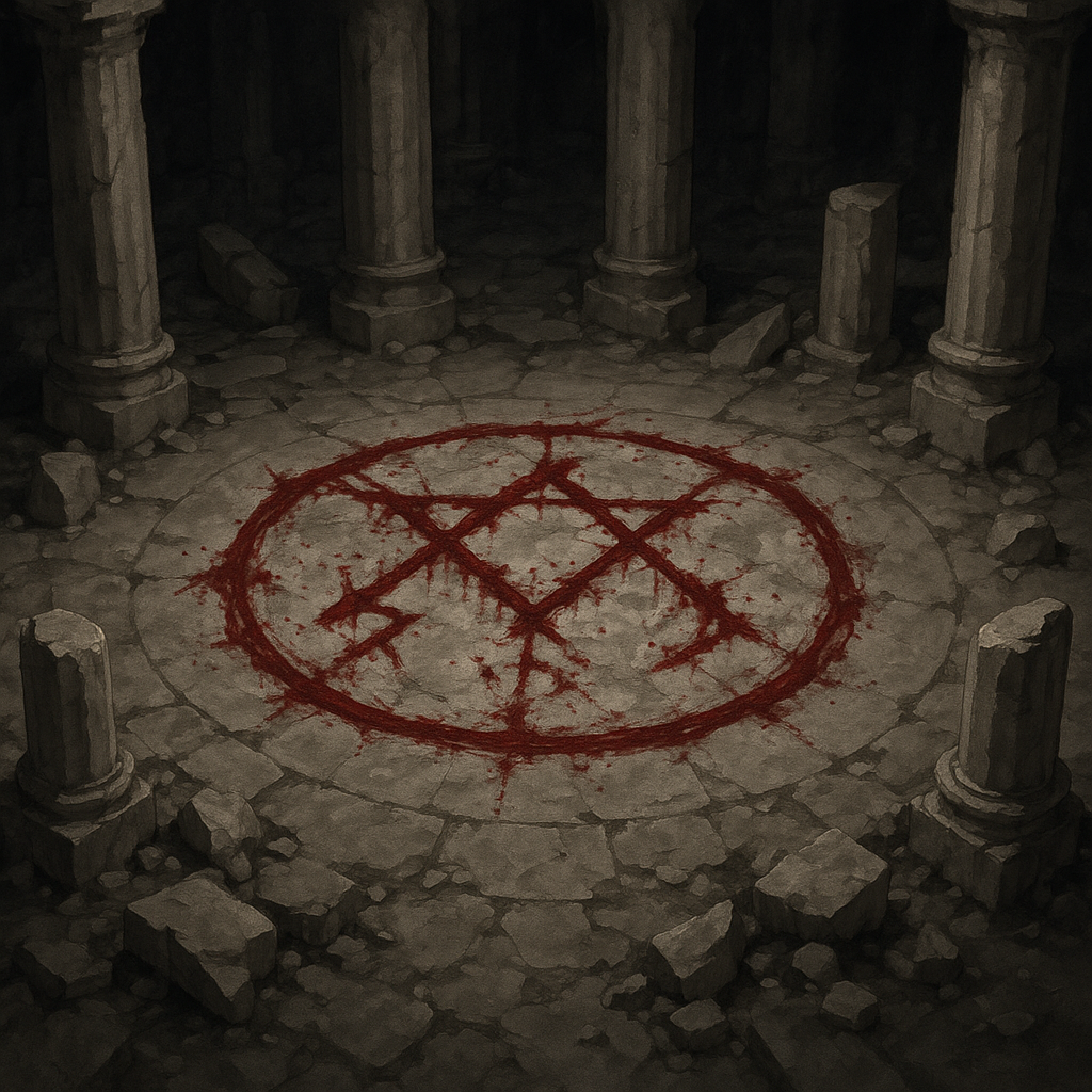 Но тогда я решил осмотреться. Войдя внутрь, я узрел что всё помещение лежало в руинах. Потолок обвален и разрушен, стены потресканы и раздроблены, и с разрушенного фасада потолка, открывающий взор на небо, шел дождь. Я особо не видел здесь какого то еще выхода. Все проходы кроме того откуда я пришел были завалены, и лишь я один был здесь, и никого другого. Я опустил свой меч и развеял пламя в ладони и прошелся вперед, туда где был Гаупнир в последний раз, и на его месте, был нарисован некий символ. Он выглядел довольно знакомым мне, правда я не мог припомнить его смысл. Опустившись на колено, я провел ладонью по руне и понюхал состав, из которой она была нарисована. Едкий, слегка теплый, разбавленный пылью и кислый запах.