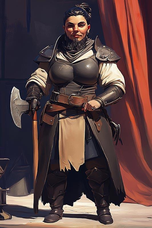— Мой персонаж: Спичка Горелая. Широкоплечая дварфийская дева средних лет. По меркам Пронесадских свах она уже дважды прожила свой брачный возраст — часики протикали, ворон крякнул «невермор», плюнул, махнул крылом и безнадёжно закурил. Она, однако, юна что духом, что секирой, и готова продемонстрировать это кому угодно. Бородка дварфихи всегда подстрижена по последней моде. (Последней, о которой она слышала. Еженедельные вестники Пронесада в это болото не доходят.) Секира за её плечами сияет как новая, а рукава закатаны по плечи, демонстрируя могучие бицепсы и некоторые ошибки молодости, на которые намекает набитый на левом предплечье пылающий то ли якорь, то ли что похуже.