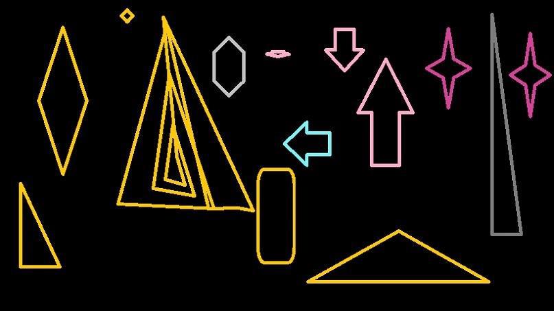 Две четырехконечные звезды розовые, три стрелки - голубые и розовые, три желтых треугольника разной формы, один остроконечный серый треугольник, который не сразу заметен, желтый прямоугольник со скругленными углами. Особое внимание привлекает треугольник, наполненный треугольниками, что создает объем этой единственной фигуре, как будто она поворачивается. Еще два желтых ромба - большой и очень маленький.