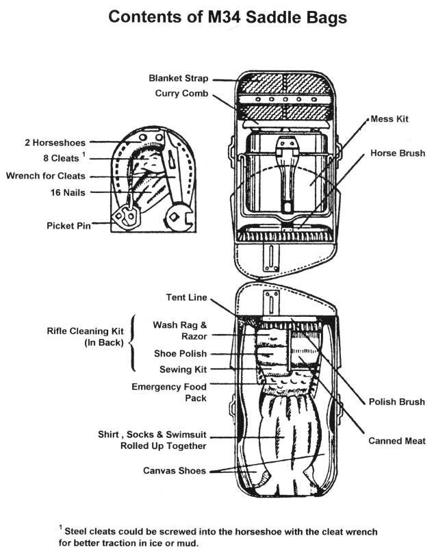 Штатные перемётные сумы М34 и их содержимое. По часовой стрелке слева сверху: контейнер с двумя подковами, 8 противогололёдными шипами для подков, 16 подковных гвоздей и шпилька для коновязи; ремень для попоны, скребок для лошади, обеденные принадлежности, щётка для чистки лошади; шнур для палатки, сапожная щётка, полотенце и гигиенический набор, вакса, швейный набор, рацион питания с банкой мясных консервов, набор для чистки оружия, запасное бельё, тапочки.