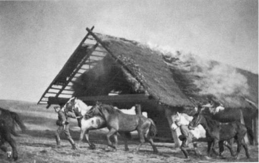 В результате атаки конюшня загорелась и солдаты пытаются спасти лошадей.