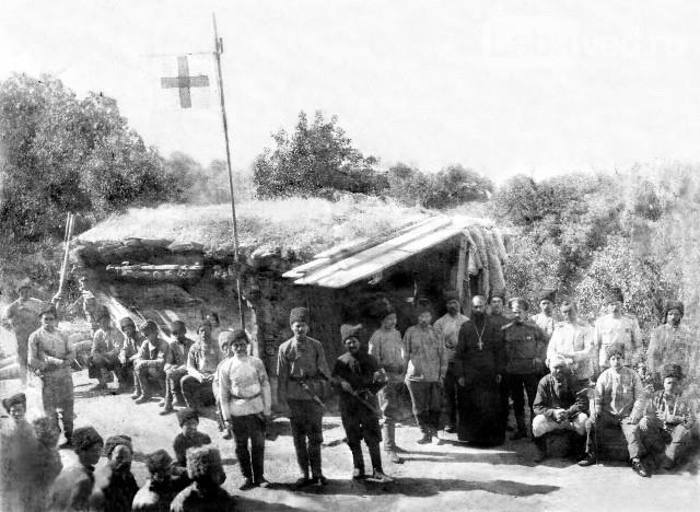 о.Стефан Дмитриев или о.Василий Никольский у лазарета 14-го Кубанского пластунского батальона.