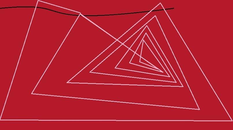 Центр картины - последняя линия внутреннего треугольника выходит за его пределы и снова образует большой треугольник, не связанный с тем, в котором сложились линии в треугольник. Конец большого треугольника тоже уходит к граням большого другого и образует геометрически замкнутую фигуру.