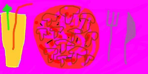 Картина передает идею радости и праздника. Фон цвета фуксии символизирует страсть и энергию, а желтый бокал добавляет ощущение радости и счастья. Красная соломинка и зеленый зонтик подчеркивают идею о том, что даже самые простые вещи могут быть наполнены радостью и красотой. Пицца красная, на ней грибы очертаниями коричневыми, и еще что-то. Вилка и нож добавляют ощущение уюта и комфорта. Вид сверху и схематичность добавляют ощущение простоты и непосредственности.