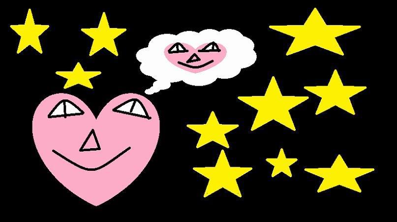 Все это на фоне черного цвета, где яркие желтые звезды - 10 пятиконечных звезд.Картина передает идею самосознания и самоанализа. Черный фон символизирует неизвестность и тайну, а розовое сердце - любовь и нежность. Антропоморфное лицо добавляет ощущение человечности и индивидуальности.