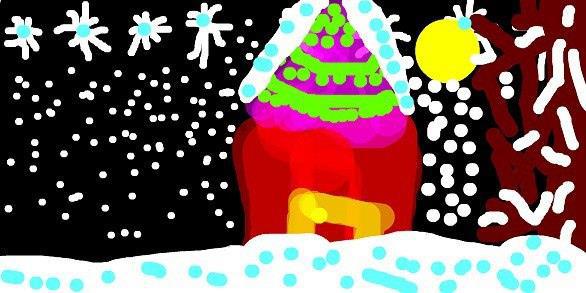 Полная желтая луна слева от дома. Дом красный, крыша цвета фуксии украшена зеленой гирляндой, а желтая дверь ждет гостей. Возможно, это красное круглое окно над дверью, а может просто декор. На двускатной крыше лежит снег.Картина передает идею зимнего волшебства и уюта.