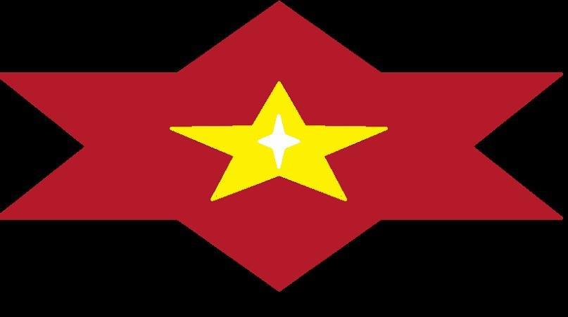 В центре звезды находится желтая пятиконечная звезда, которая значительно меньше по размеру. В центре желтой звезды расположена белая четырехконечная звезда.