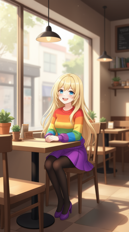 Но вот его зрение, словно наткнувшись на невидимую преграду, резко остановилось. В дальнем углу, у самого большого окна, за которым буйствовала непогода, сидели две девушки. И одна из них смотрела прямо на него. Это была та, что вся казалась воплощённым светом, сиянием, вызовом хмурому дню. Её волосы, цвета спелой пшеницы и утреннего солнца, мягкими волнами обрамвали лицо с нежными, но выразительными чертами. На ней был тот самый знаменитый радужный свитер, пёстрый и весёлый, а из-под него выглядывала фиолетовая юбка, глубокого, сочного оттенка, напоминающего о сумерках в горах. Но главное — это были её глаза. Широко распахнутые, невероятно живые, они были цвета незабудок, умытых летним дождём, или чистейшего горного воздуха. И в этих бездонных, искрящихся глазах, в самой их глубине, плясали весёлые огоньки, словно отражавшие всю радужную палитру её одеяния.
