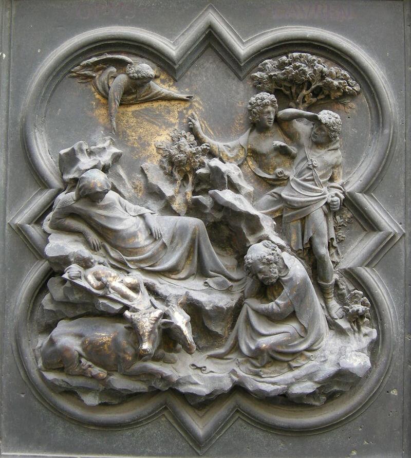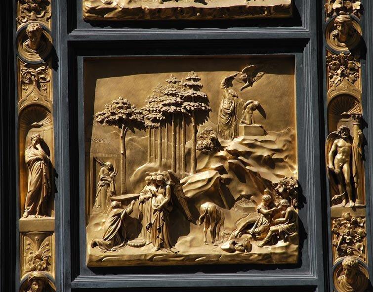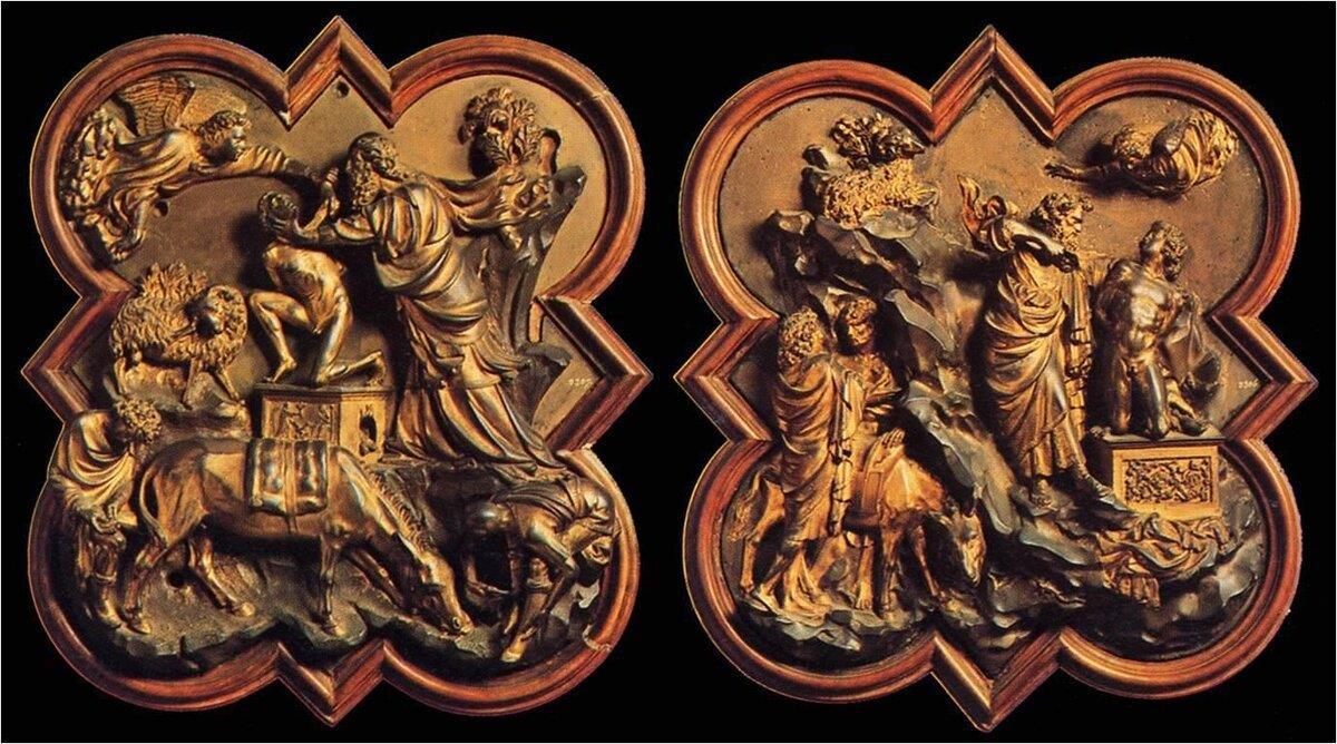 Их можно рассматривать долго — деталь за деталью. Восхищаться виртуозностью и выразительностью каждой фигуры. И вновь Гиберти создал жертвоприношение Исаака. Посмотрите, какой большой путь прошел Гиберти от той первой конкурсной работы. Тот же сюжет, но насколько иначе он решен. Это не только возросшее мастерство, но и мудрость человека, узнавшего жизнь.