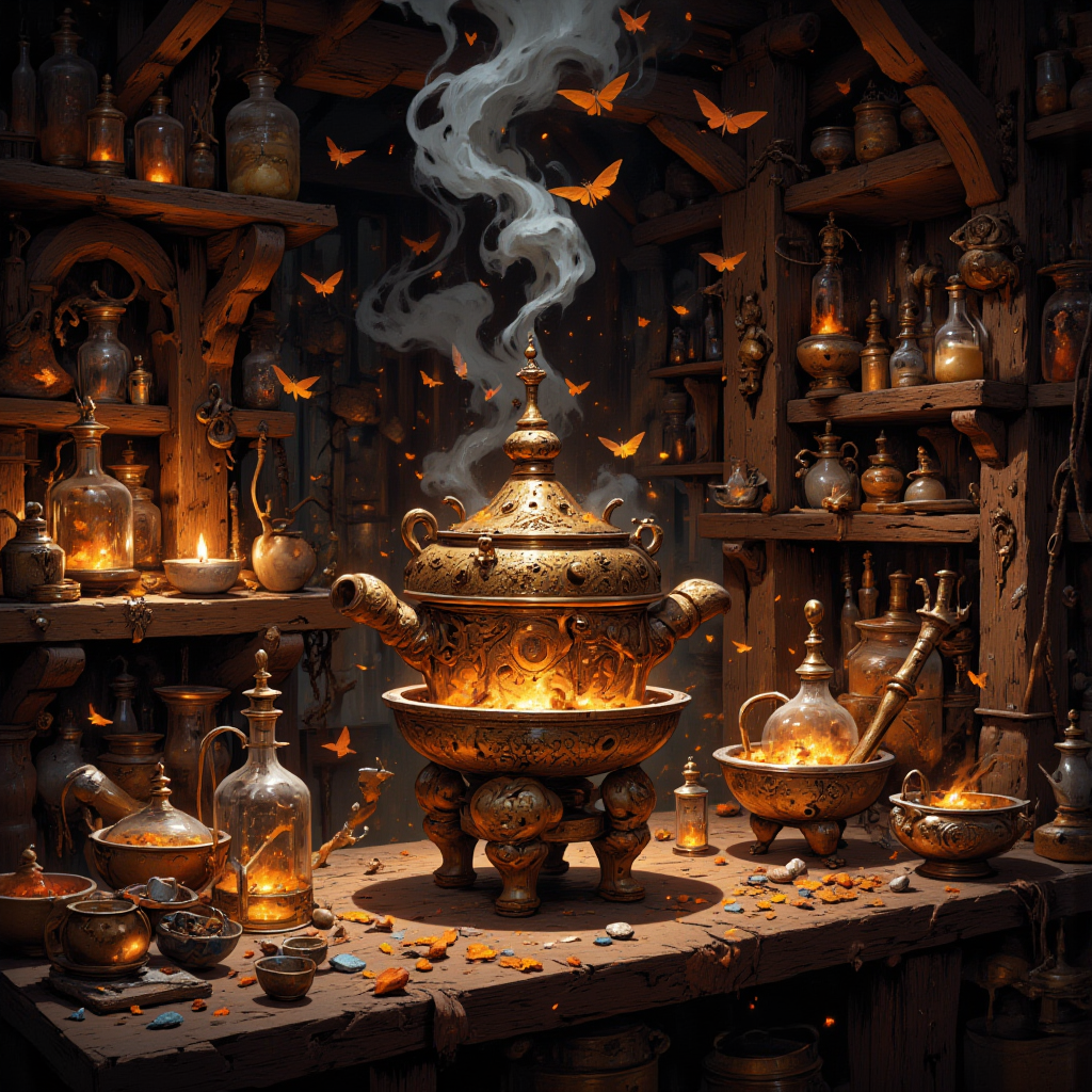 На столе посреди лаборатории возвышалась печь для варения пилюль, точно такая, как в китайских дунхуа — круглый сосуд самоварного золота на трёх изогнутых ножках, усеянный драгоценными камнями и с отверстиями в крышке.