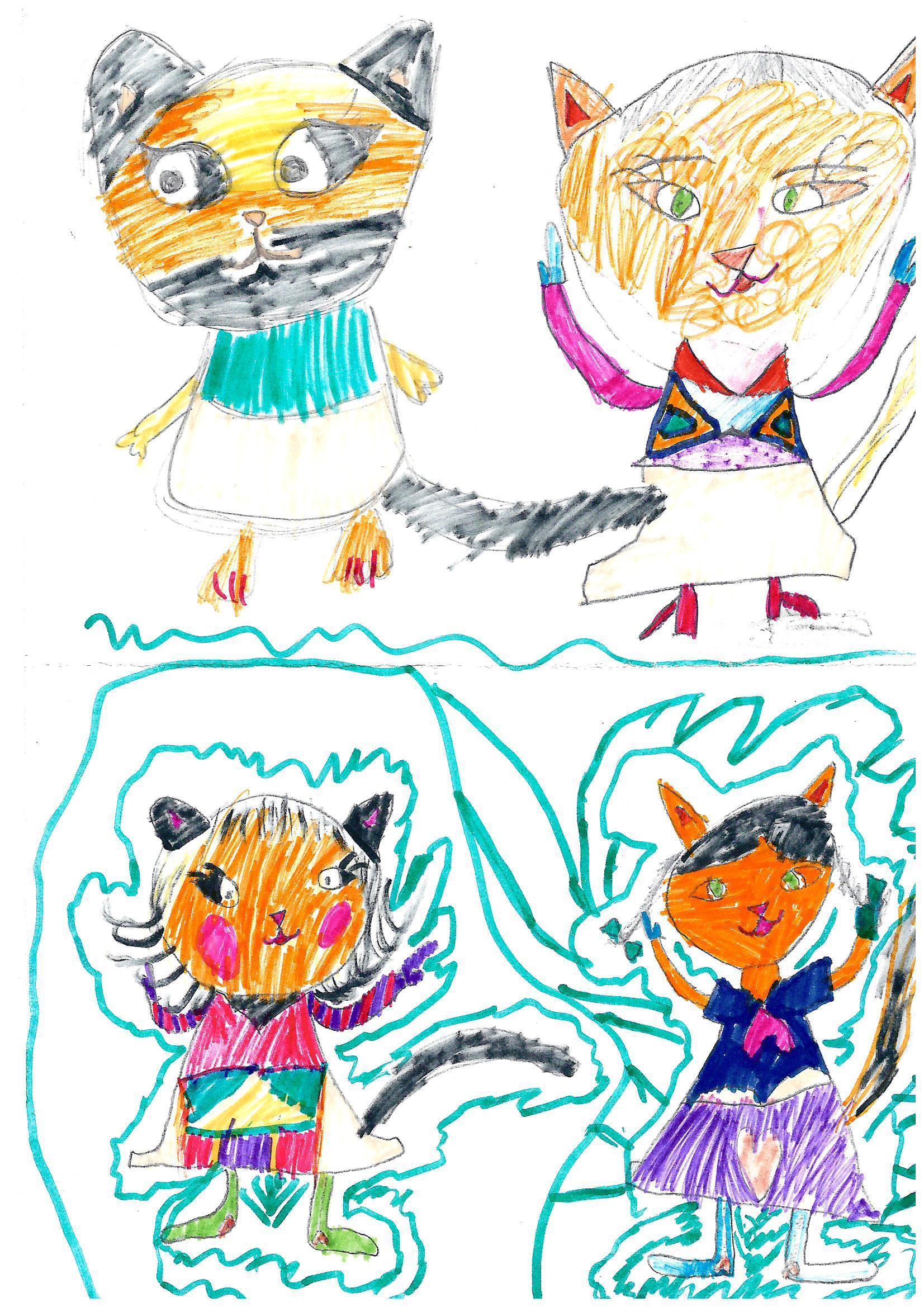 Краски, использованные для раскрашивания кошечек, яркие и насыщенные, местами выходят за пределы контуров, придавая рисунку живость и непосредственность.