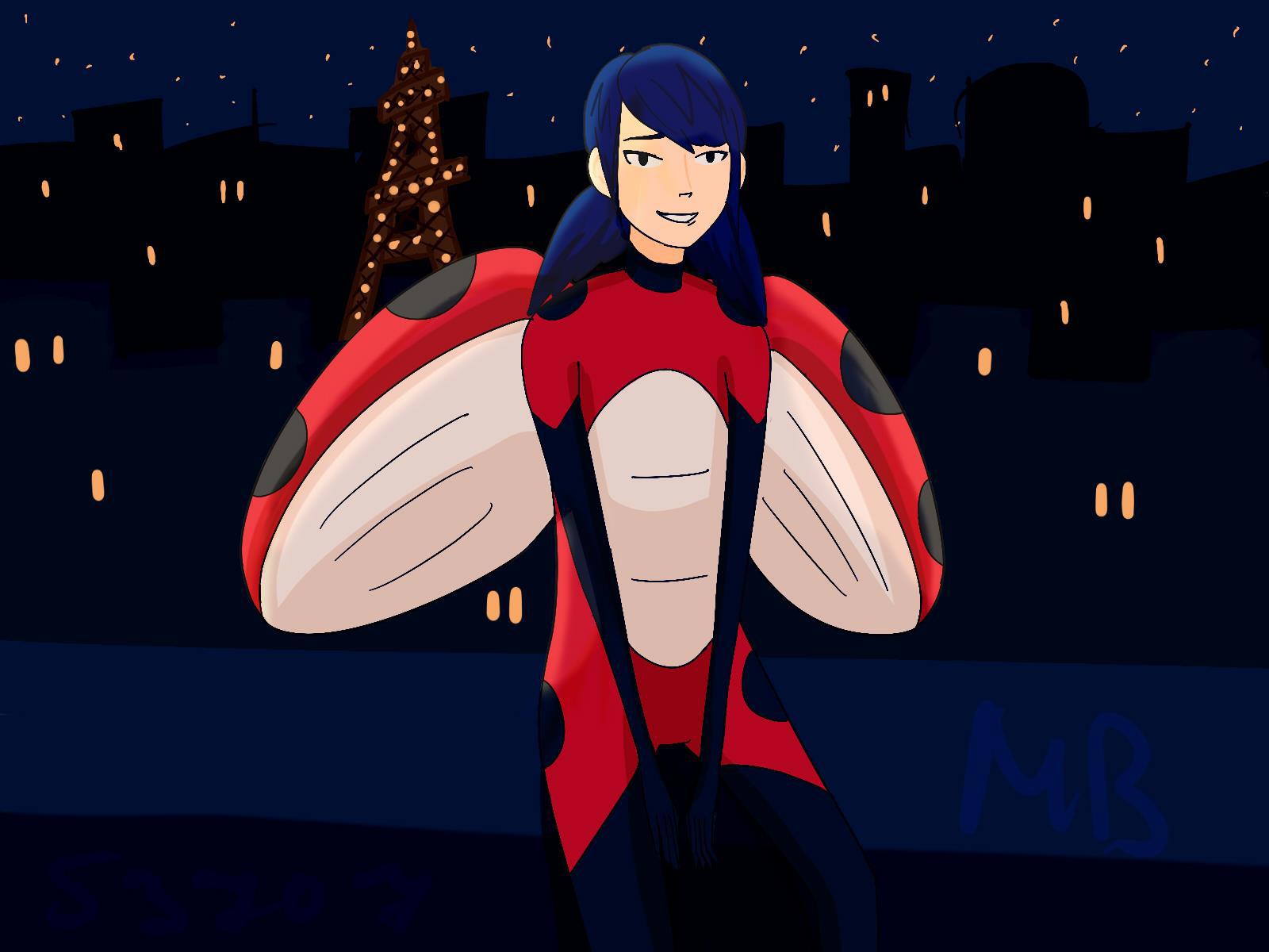 Это обычная девушка по имени Маринетт, которая днём учится в школе, а ночью превращается в супергероиню Леди Баг, чтобы защищать Париж от злодеев. На этой картинке Леди Баг изображена сидящей на скамейке или крыше дома, позади неё видны Эйфелева башня, ночные дома и звёзды. Она одета в костюм Божьей коровки с раскрытыми крыльями, её руки сложены вместе и опущены между ног.