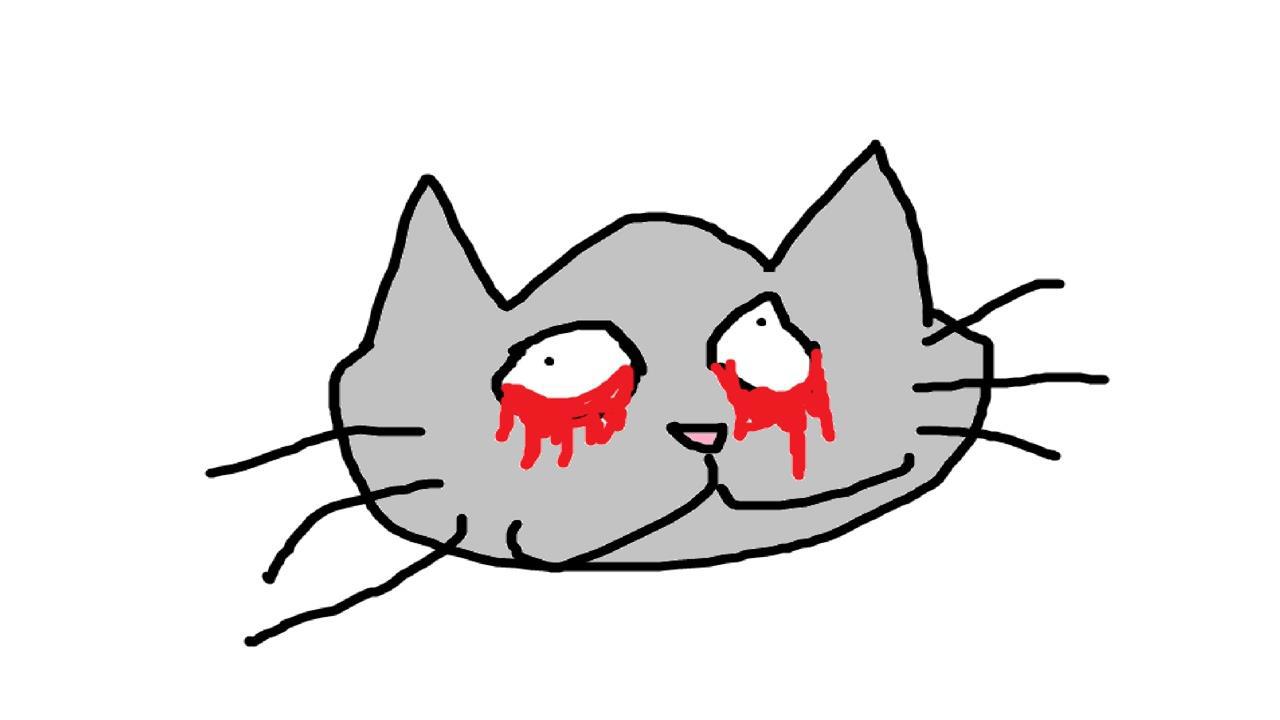 Из глаз кошки текут красные слёзы, один глаз направлен вверх, другой смотрит прямо. Усы кошки торчат в разные стороны, добавляя её образу забавности и непосредственности.